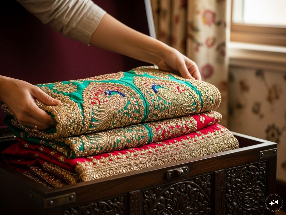 लहंगा और सूट को हमेशा कॉटन या मसलिन कवर में रखें. प्लास्टिक बैग में रखना खतरनाक हो सकता है क्योंकि इससे नमी और बदबू जमा हो सकती है जिससे कपड़े पर फंगस हो सकता है. इन्हें हल्के फोल्ड में रखें और भारी वर्क वाले हिस्सों पर दबाव न डालें, ताकि सिलाई और एम्बेलिशमेंट सुरक्षित रहें.